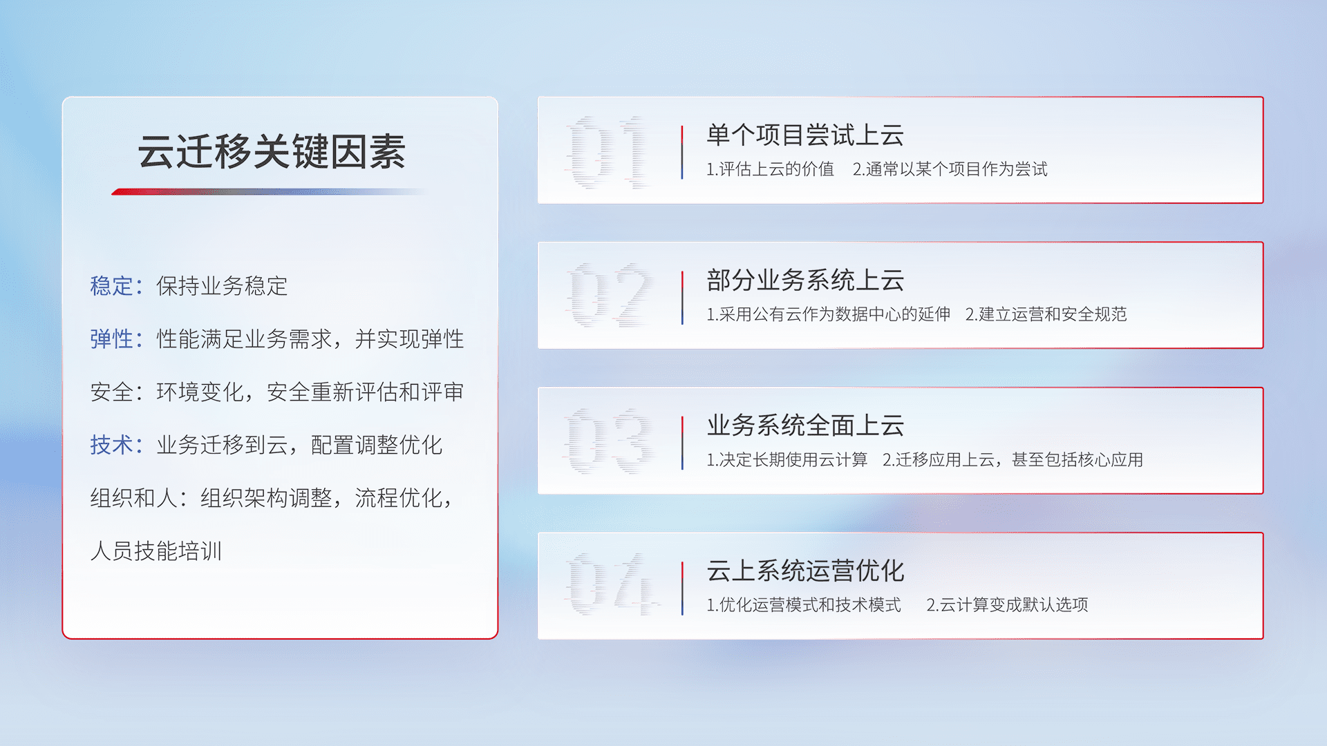 结合实际业务,,,,从规划设计、、、、云平台选型、、云原生改造、、数据迁移、、集成交付,,迁移全过程为客户识别最佳上云路径,,,,做好风险识别管理,,,设计网络架构、、、身份权限、、、安全审计合规、、、操作审计、、日志审计、、、、监控告警策略、、多站点容灾设计等,,对云上基础设施进行整体规划,,,,提升IT治理水平,,,以满足弹性、、、、高可用、、高性能的需求。。