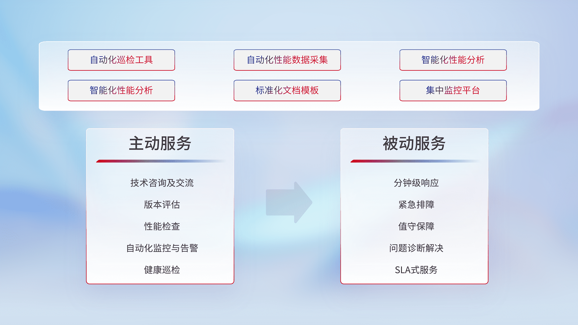 智能化工具和标准化文档,,,保障服务质量,,,提供主动服务(包含技术咨询、、、、版本评估、、、性能检查、、、自动化监控与告警、、、、健康巡检)和被动服务包含(分钟级响应、、、紧急排障、、值守保障、、、问题诊断解决、、、SLA服务)。。。